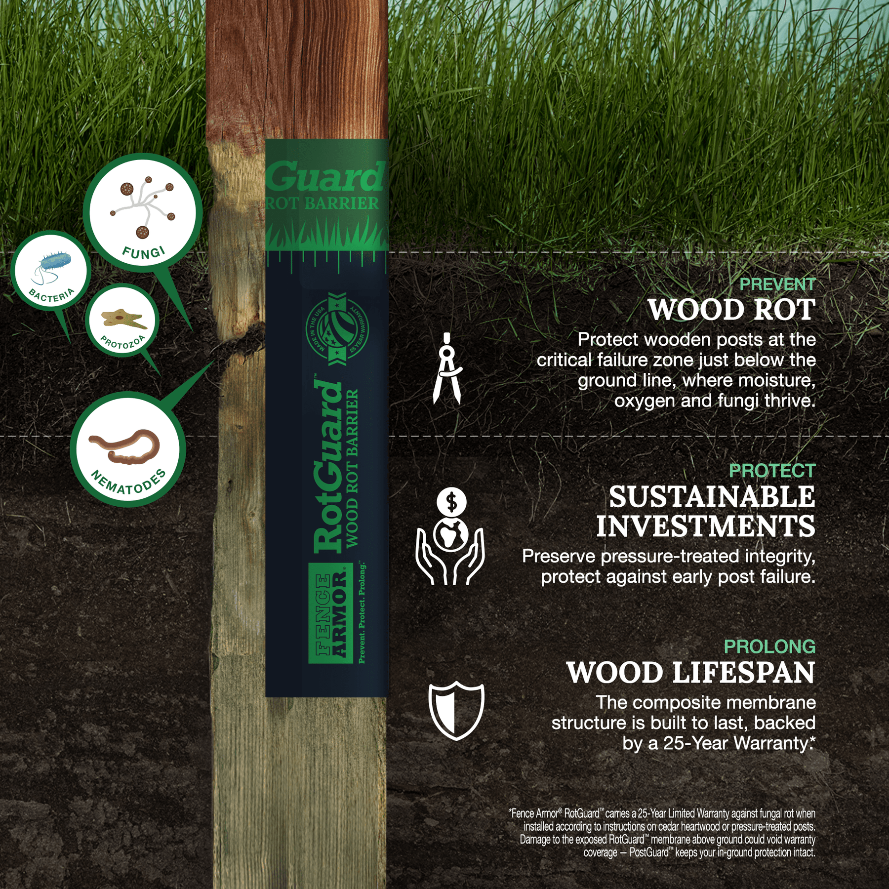 Fence post wraps, like RotGuard™, provide an affordable and highly effective way to protect this area. By creating a durable, water-resistant barrier, they block moisture and oxygen that feed fungal growth, helping to prevent ground-line rot and extend the life of your posts.